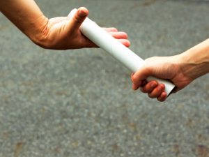 他に、hand over(引き渡す)、take over(引き継ぐ)もバトンタッチの意味で使うことがあります。